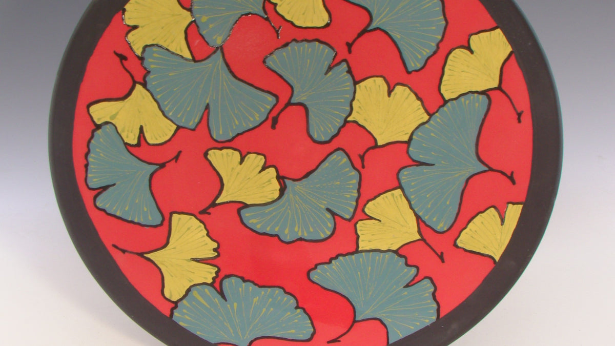 My forms are simple and quiet so that I can use surfaces as a canvas for both stylized nods to nature and happy doodles.  My pieces are wheel-thrown clay – lamps, bowls, chargers, lidded jars. Low-fired with colorful, layered matte slips and glazes. I am also getting some interesting pieces with primitive firing, using metallic oxides like iron, silver, and copper, where the elusive main element is the ghost of an actual leaf.  I love to make table lamps and to go through my paper collection to find just the right colorway and texture for each lampshade.