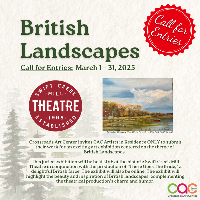 This juried exhibition will be held at the historic Swift Creek Mill Theatre in conjunction with the production of "There Goes The Bride," a delightful British farce. The show will highlight the beauty and inspiration of British landscapes, complementing the theatrical production’s charm and humor.