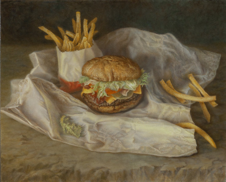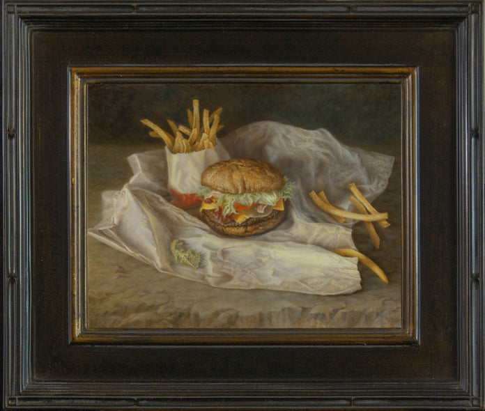 I wanted to present a modern burger and fries in a dramatically lit composition, reminiscent of Baroque still-life paintings in landscape settings.