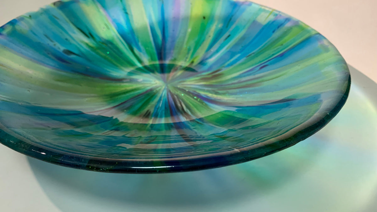 Jennifer’s creative journey in kiln forming began in 2003 after a few years working in stained glass. When she began melting glass in a kiln, the door opened wide to structure, design, geometry in nature, and color theory all at once.