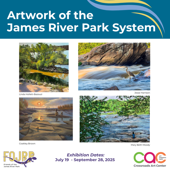 In Partnership with Friends of the James River Park, Crossroads Art Center is hosting a call for entries for artwork that features the James River. A portion of the sales from this exhibition will benefit the Friends of the James River Park.
