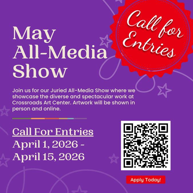 All Media Juried Exhibit: All Media is accepted for entry in this exhibit. There is no theme for this exhibition. Accepted work will be shown LIVE at Crossroads Art Center, as well as Online on the website. Juror: TBA