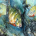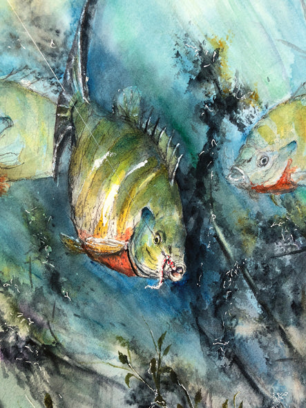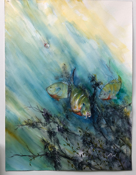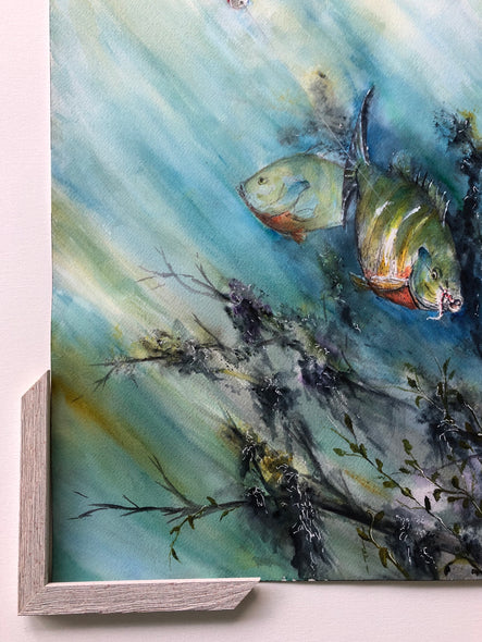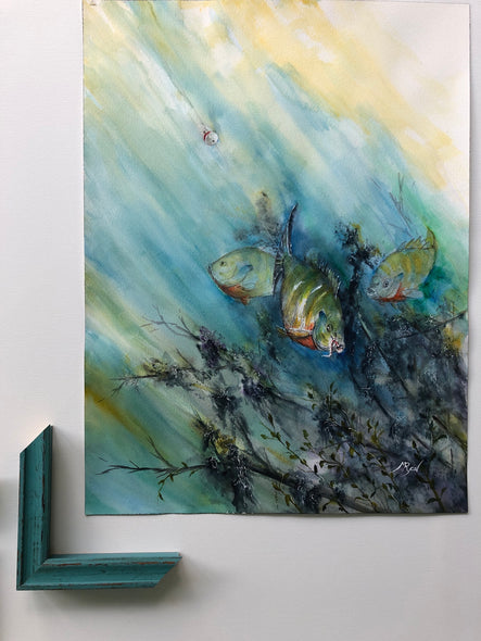 Bluegill Hooked is a colorful watercolor painting of 3 Bluegill pals swimming in underwater vegetation, while one of the the group gets hooked! Streams of light coming from the surface highlight the surprised fish in the grasses below. Ryon's use of a range of bold blues and greens lends this 18" x 24" watercolor perfect for a beach house or river cottage. Framed with a mat, the size could be increased to 24"W x 30"H. Framing options are shown below. Framing can be arranged for you at an additional cost. Please inquire if interested.