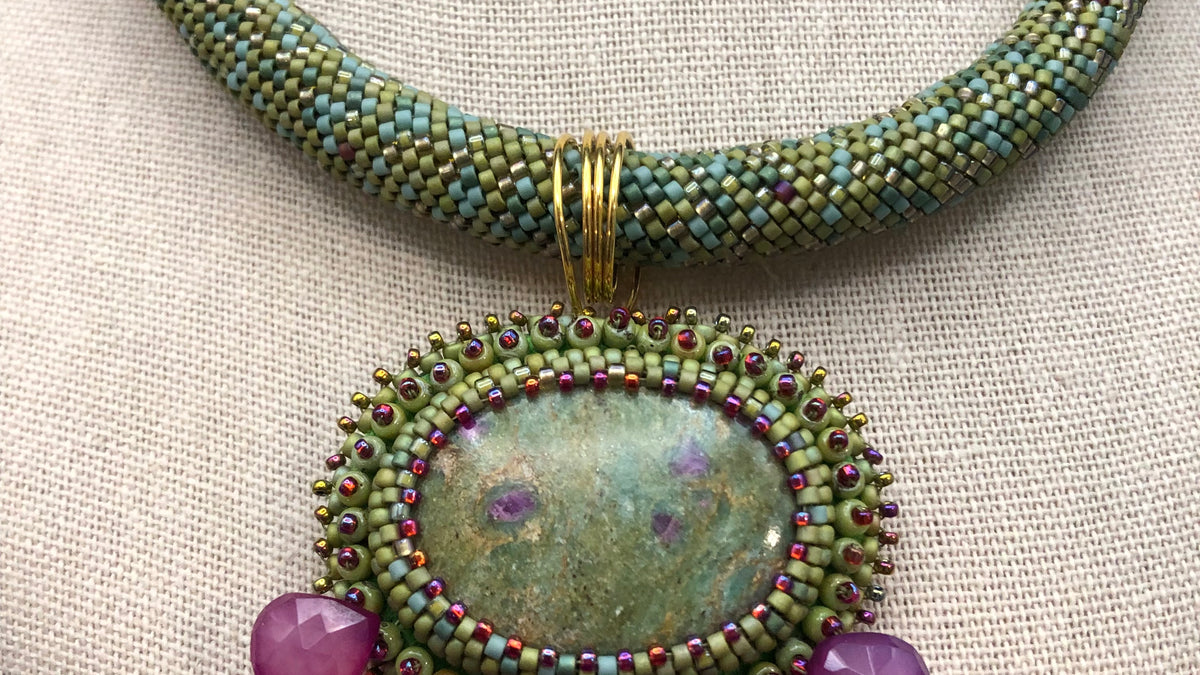 Seed beads are her first love due to color choices and being able to “paint” with them either in peyote stitch or in bead embroidery. She has worked in many types of jewelry design from fine silver to wire work to polymer clay but seed beads with natural stone cabochons are her favorite.