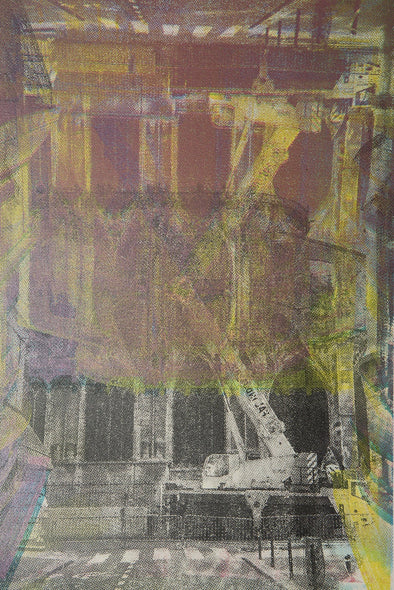 This large unique print displays the artist’s technical experimentations while showcasing themes related to the rebuilding efforts that began after the Cathedral’s 4/15/2019 fire. The artist created this artwork during the two months immediately after the fire on site at the Cite Internationale des Arts which is located just across the Seine from the Cathedral. The artist’s on-site prints of Notre-Dame feature an exploration of, and experimentation with, unconventional techniques (including off-registration), inks (including phosphorescents and pearlescents), and fine papers (including Clairefontaine noir). No two prints are the same. This print is from a series of unique prints that have been exhibited in Paris and in the U.S. Proceeds from the sale of this unique print are donated for the Cathedral’s rebuilding fund.