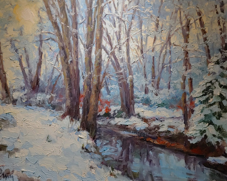 This painting was inspired by a series of walks I took during a beautiful snow this winter in out town of Ashland, VA. Stony Run Trail is a quiet walk that runs alongside Stony Run Creek in the town. Each snow seems to be a little different, but this particular snow created the most dazzling snow-laced trees that gave me the feeling of true winter wonderland.