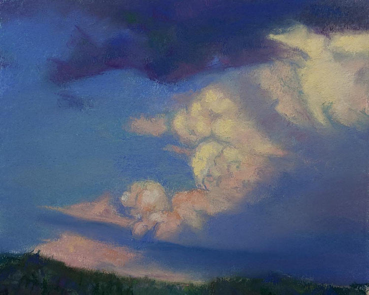 I am delighted to paint clouds, always different moods, always differently colorful.  This is from a class demo, using an analogous color scheme, in soft pastels.