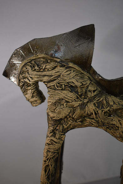 Roberto, a horse from Eqqumarka, has been built with four layers of clay. The first three create the structure, the last, is a very textured surface. The slab, gets the stain in powder, brushed. The first layers are cut and built leather hard, and the drying very carefully maintained. Glazed to cone 5.