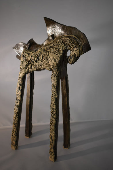 Each of my pieces is an experiment: with different clays, different firing and color techniques, structuring different creatures and textures. I work the structure first, then I try different textures and firings; at the beginning I did a lot of raku firings, now, I do wood firings: I use a barrel contraption and other ways. I still use regular cone firings, specifically for the containers; I collect rare plants, so, I create containers to go with their specific characters ????