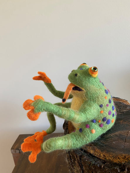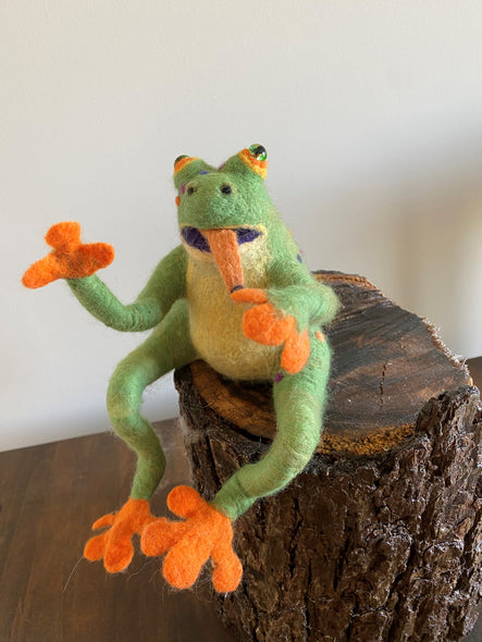 Welles & Company: Jocelyn Welles Title: Green Frog Sitting Jocelyn Welles $95.00 Default Title - $95.00 QTY Add to Cart Welles & Company: Jocelyn Welles Green Frog Sitting Needle-Felted Merino Wool with Glass Eyes 5"w x 7"d x 5"h $95.00 Collection: View Collection